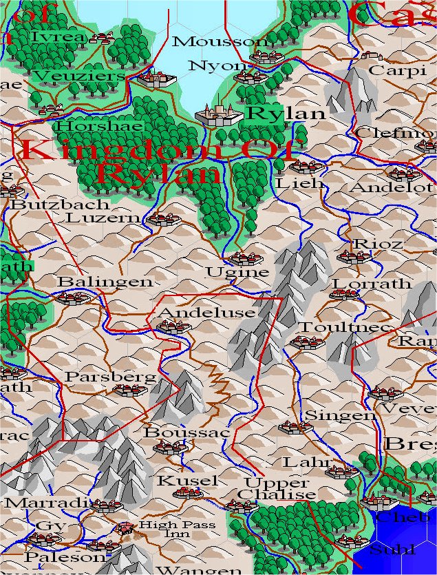 Rylan is divided by the Western Rim Range, with the largest portion to the north which is a lush rolling sub-tropical rain forest which is spotted with farming areas as it rises to the heights of the rugged Rim Range. The southern portion of the Kingdom is the Duchy of Cheb, and while being a highly productive area of Temperate Forest and Farming plots Cheb rarely these days produces much of a useable nature as the Chebians are strongly resisting Rylanian Rule and the Army of Relmandia is constantly striking at Rylanian Outposts.
